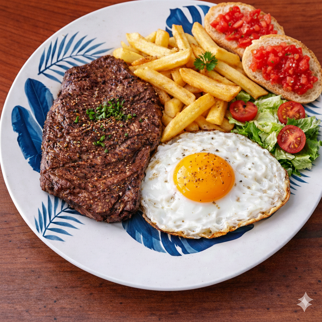 Bistec amb patates fregides i ou ferrat -14€